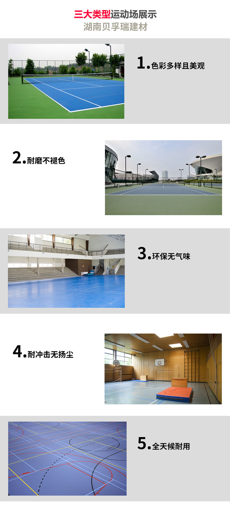 5、技術(shù)穩(wěn)定性:無論是大球還是小球的回彈性、吸震性及摩擦系數(shù)能貫穿整個場地系統(tǒng),保證其技術(shù)穩(wěn)定性。6、理想的綜合功能:適用于室內(nèi)外籃球場,網(wǎng)球場,排球場,羽毛球場,手球場,休閑場地,健身房等多項運動地面。
